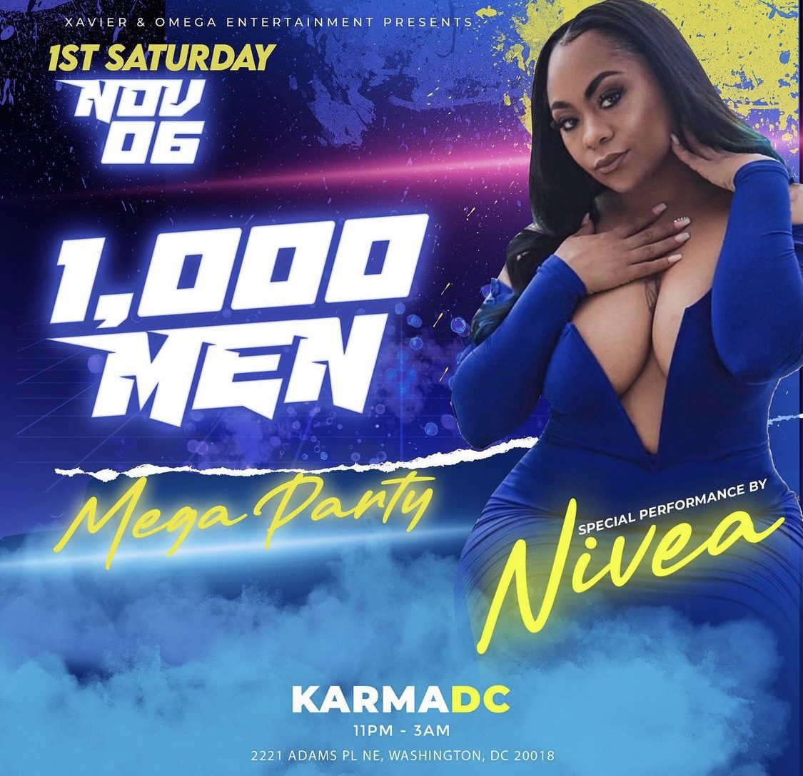 1000 Men Mega Party Special Performance by Nivea Details Date:Saturday, November 6, 2021 Time:11:00pm - 3:00am ET Category:Day Party Tickets Presented By:Xavier & Omega Entertainment VenueKarma Address:2221 Adams Pl NE, Washington, DC 20018 Website: Tickets Add To Calendar Google Calendar Yahoo Calendar Share