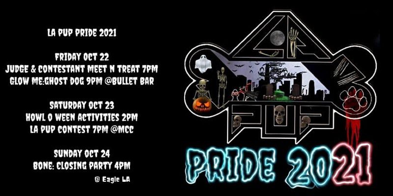 Saturday Oct 23 The LA Pup Contest 7pm 18+ $10 21+ open bar available with $45 Weekend Pass. Contestants will show you all their unique minds, fantasies and style. Find out who will be the next LA Pup. Watch Orion step aside speech. Winner announced. Community Awards.
